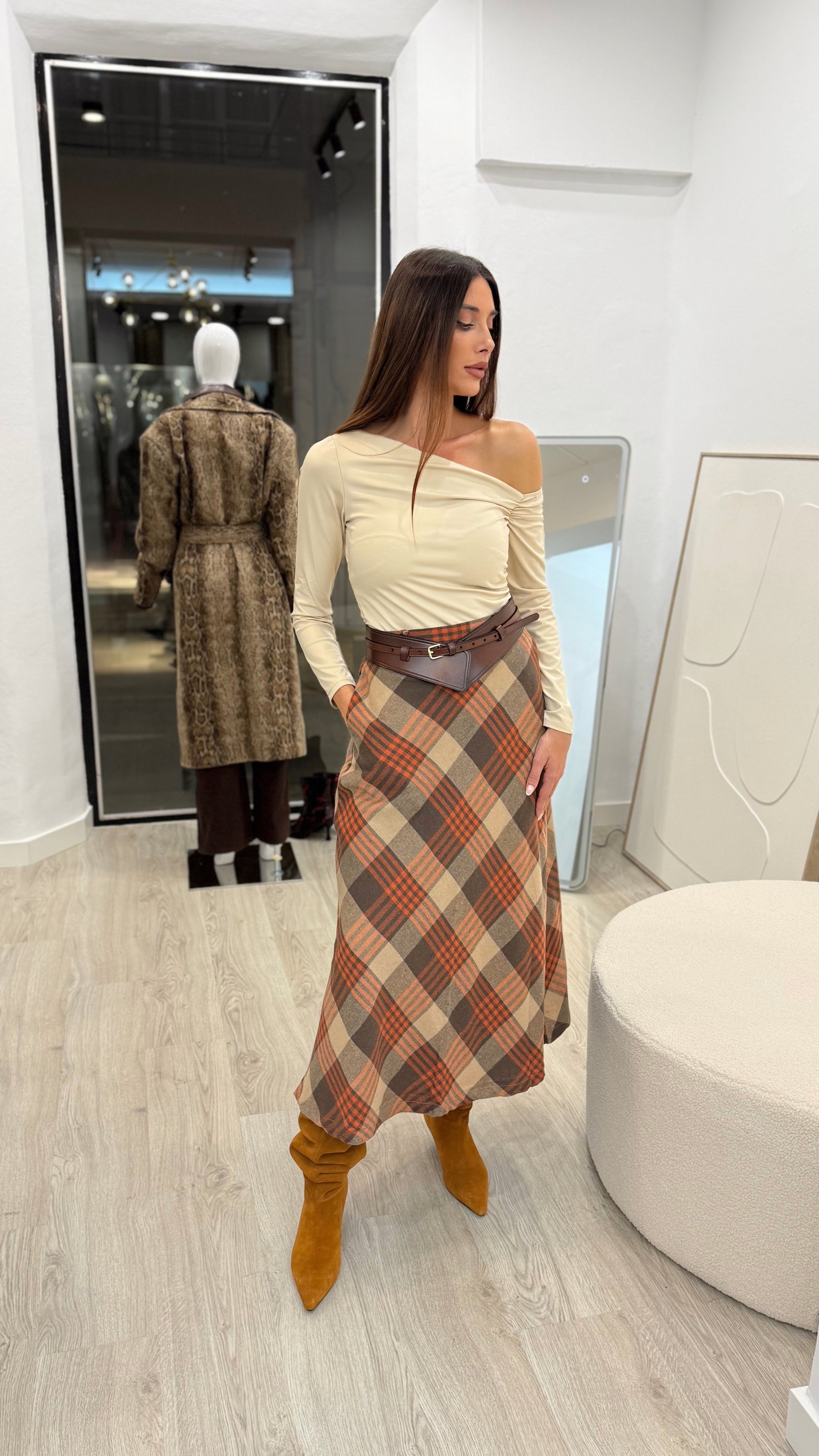 Falda de cuadros midi en tonos marrón chocolate, teja y beige.