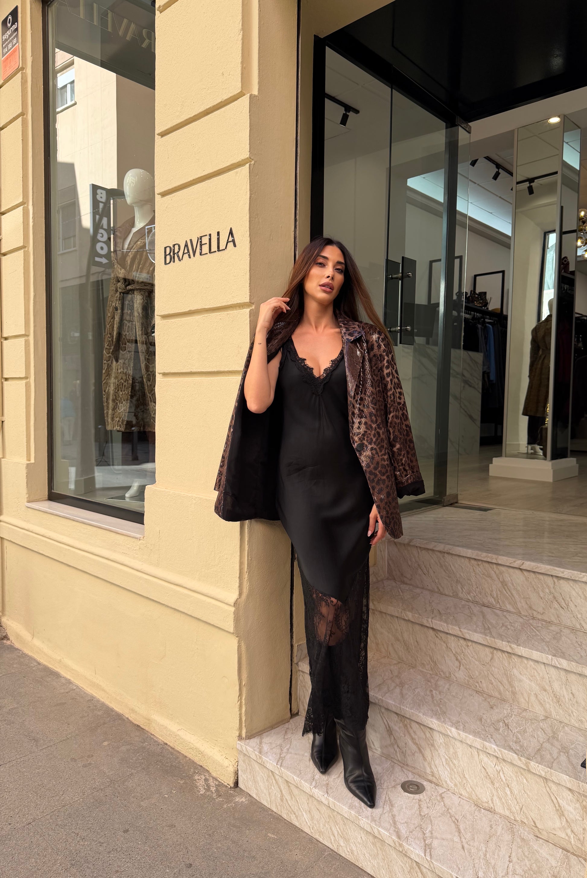 Vestido lencero al bies confeccionado en tela suave y fluida que se adapta delicadamente al contorno del cuerpo. Su corte al bies realza la figura de forma natural, aportando movimiento y una caída elegante. Presenta tirantes finos ajustables, escote sutil y un acabado minimalista con encaje que lo convierte en una prenda versátil, ideal tanto para ocasiones casuales como para eventos nocturnos.